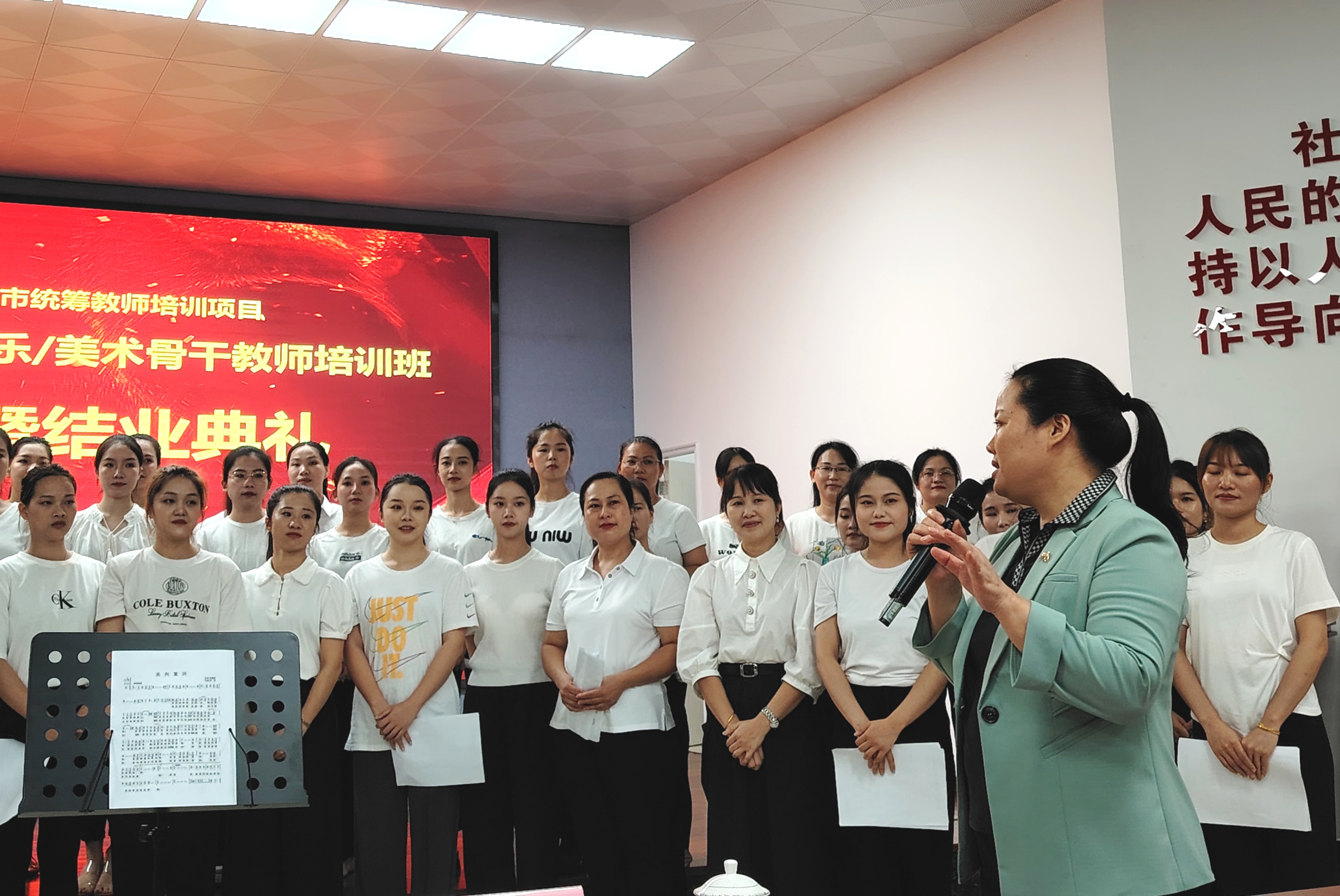 为了提升培训实效,组织开展了美术班学员课堂优秀作品展示活动,展出了学员们的中国山水画、花鸟画、陶艺和剪纸等数百件优秀作品,在展览现场,孔令宇经理对学员作品进行了点评。在教学成果展示汇报演出中,音乐班学员表演了舞蹈《灯火里的中国》,朗诵《音师共赏之师心无悔》,表演唱《灵山姑娘真好样》、《漓江情》,合唱《请到灵山荔乡来》、《没有共产党就没有新中国》等9个节目。