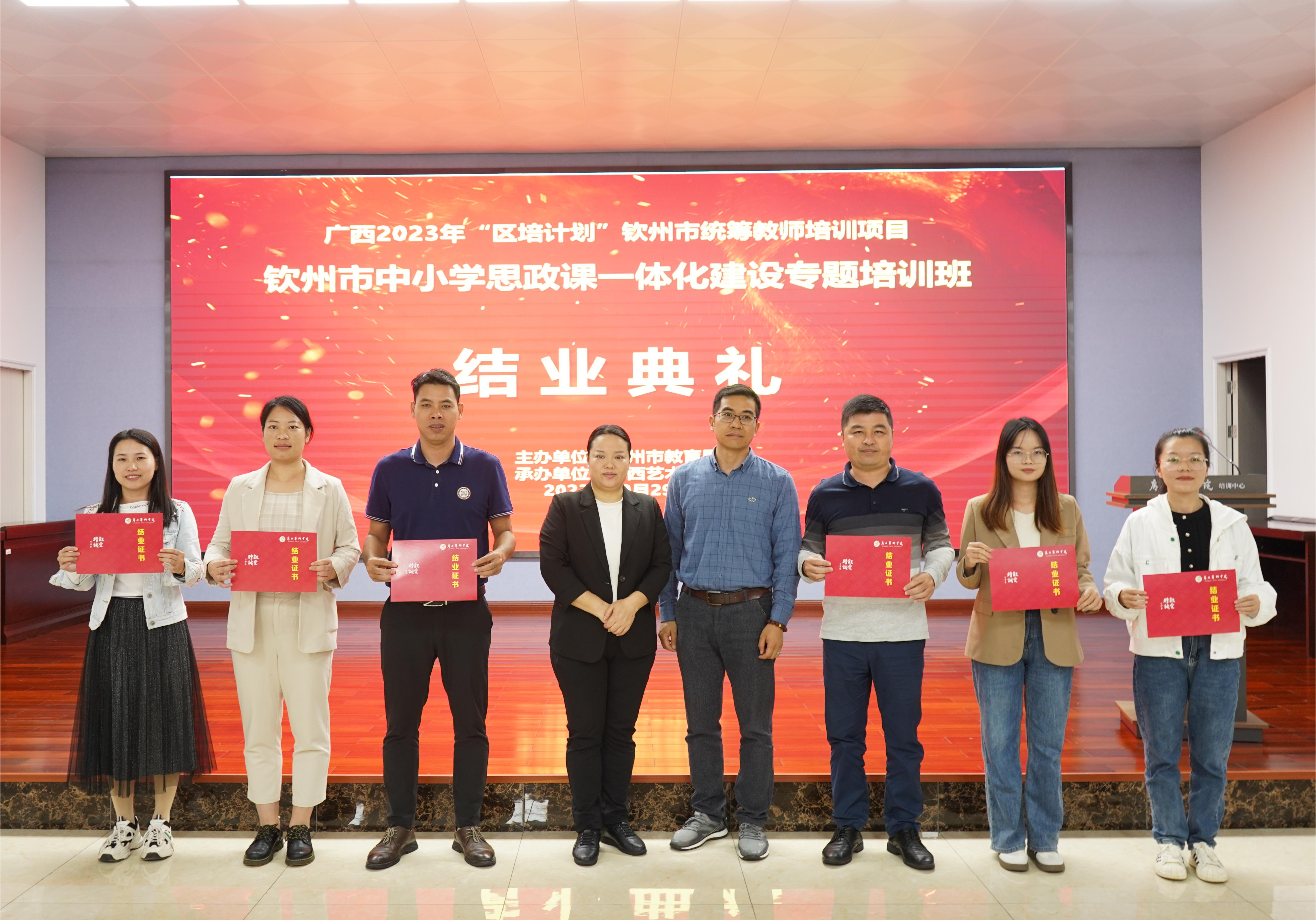 在钦州市中小学思政课一体化建设专题培训班结业典礼上,阳丁玉副科长和于毅荣科长分别对本次培训项目做了总结发言,同时,并为学员代表和优秀学员分别颁发了结业证书和荣誉证书。学员代表黄春燕做了学习体会发言。